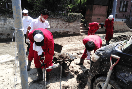 西日本災害時、1カ月、社員10人が毎日現地にてボランティア活動。
